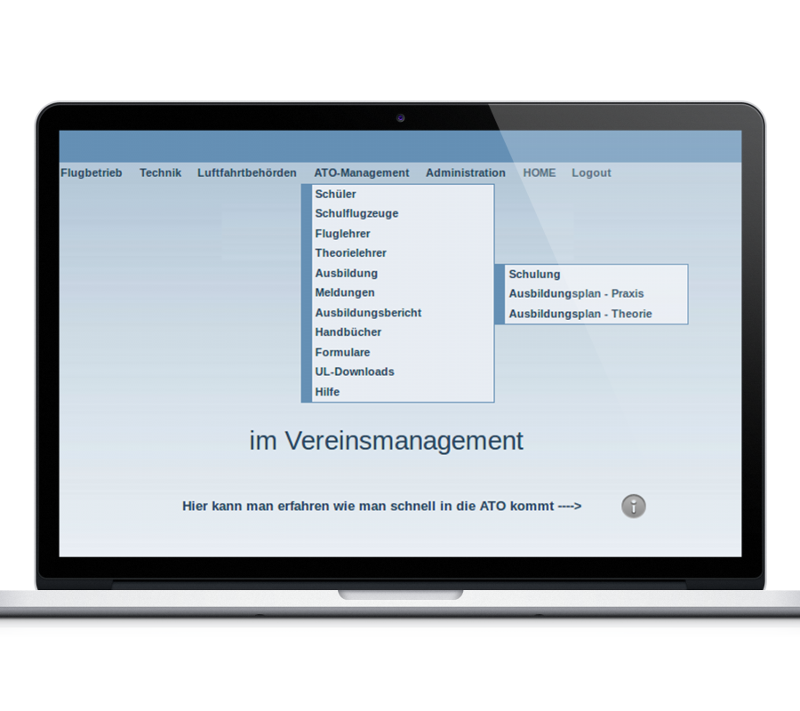 Air-Software hat ein ATO-Managementsystem (Approved Training Organisation) entwickelt, das sich sowohl in unser bestehendes Onlinekonzept einbinden, als auch als Einzellösung betreiben lässt. Verbänden mit einer globalen Ausbildungsgenehmigung steht eine Verbandslösung, in die alle angeschlossenen Vereine integriert sind, zur Verfügung. Flugschulen oder Vereine mit eigener Ausbildungsgenehmigung können ebenfalls unser ATO System nutzen.